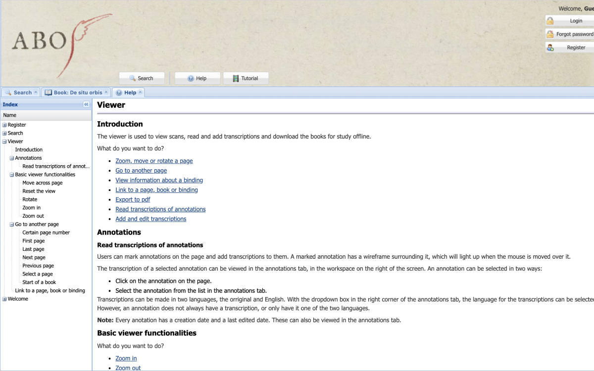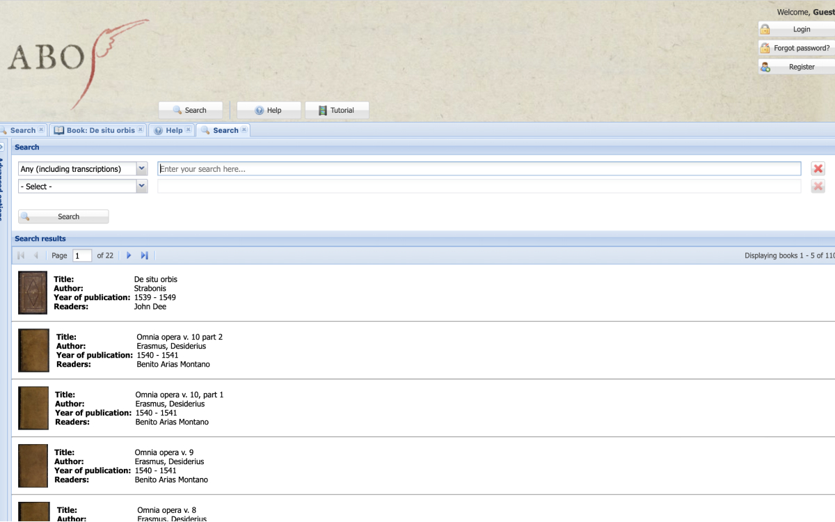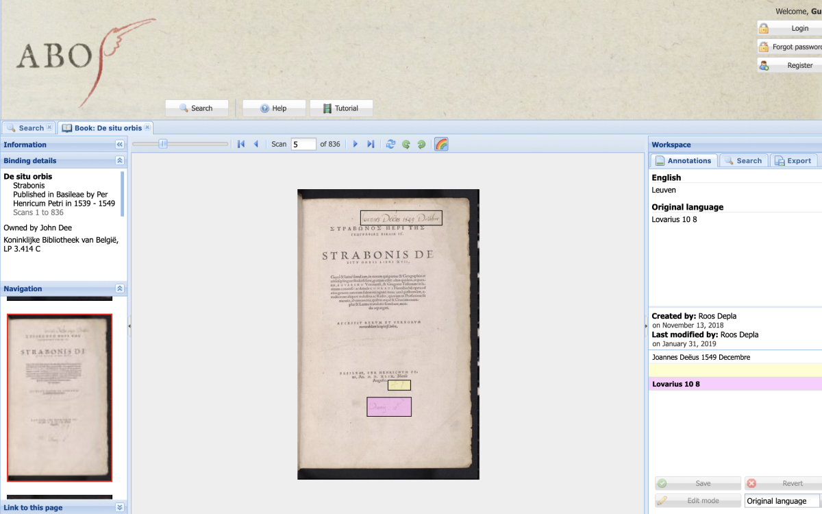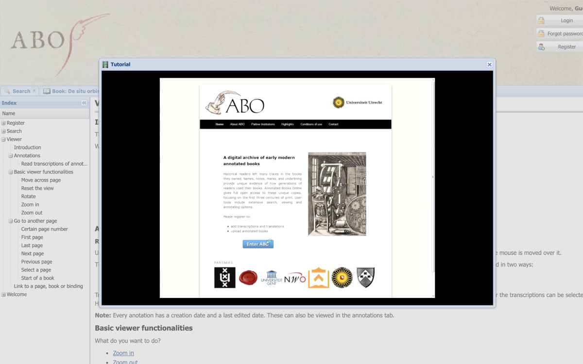 Reading is a crucial form of intellectual exchange, but it is also an elusive activity, something that can be done in very different ways. To uncover the history of reading historians look for traces of these different reading practices. Handwritten annotations in books are an important key to understand how historical readers used their books. ABO aims to bring these books together. It is a digital library that reveals the variety of traces that readers left in their books. These examples were previously dispersed over many different libraries in the world. Yet it is also a digital laboratory, where visitors can work together: ABO has tools to enrich the early modern annotations with transcriptions and translations.