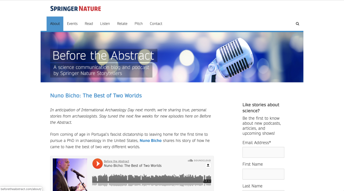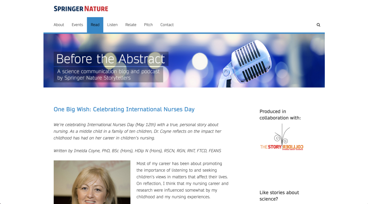 Before the Abstract, bringing you the real-life stories from researchers on the front lines of discovery. Springer Nature Storytellers and the Before the Abstract website are both part of an endeavour by Springer Nature to highlight the importance and utility of storytelling in science. As the need to communicate research beyond the confines of scholarly circles grows, Springer Nature is offering authors and potential authors the opportunity to talk about their real-life experiences as researchers, in their own words. We feature these personal stories through a mix of podcasts recorded at live events and written submissions, as well as a section featuring discussions on storytelling in scientific communications and tips on how to craft a narrative.