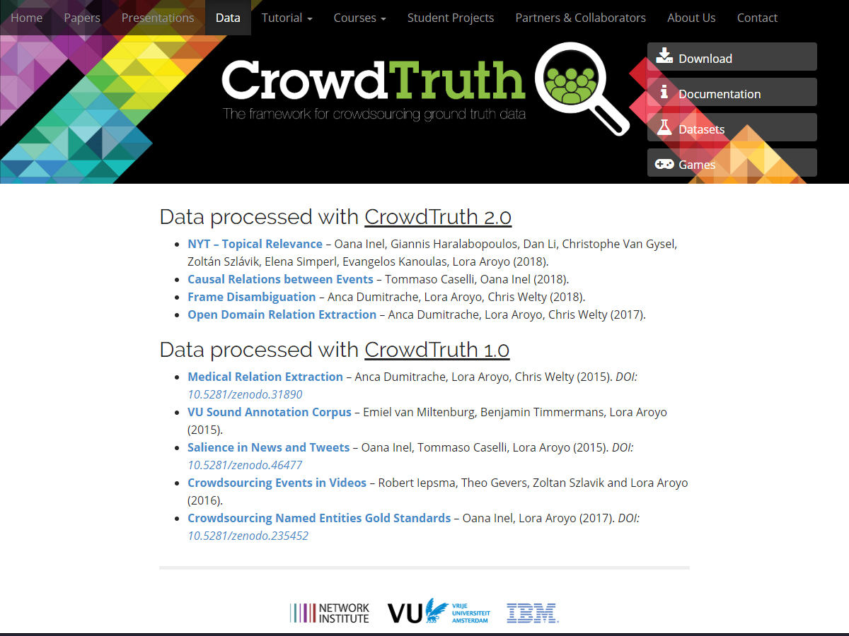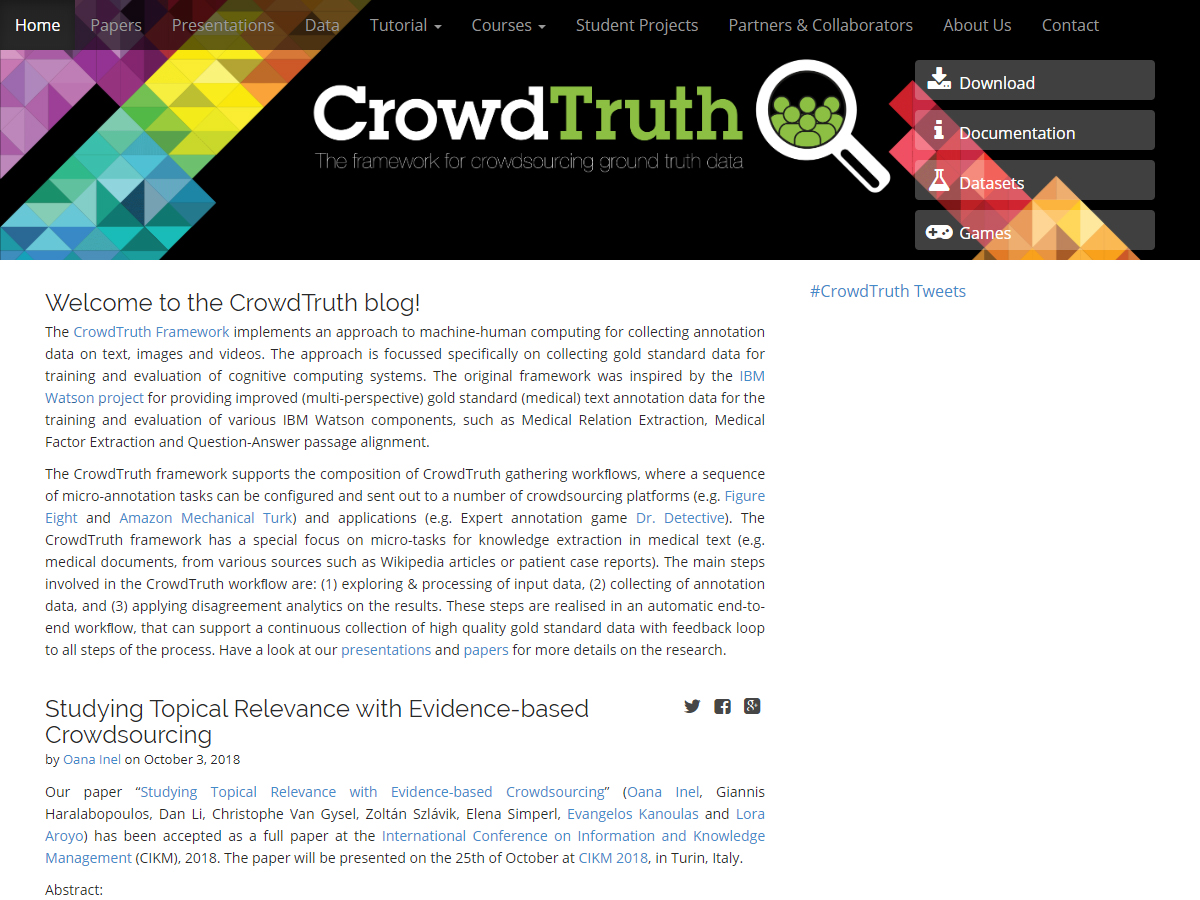 CrowdTruth is an approach to machine-human computing for collecting annotation data on text, images and videos. The approach is focussed specifically on collecting annotation data by capturing and interpreting inter-annotator disagreement.