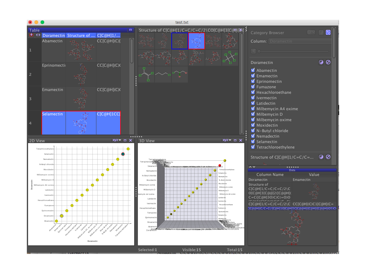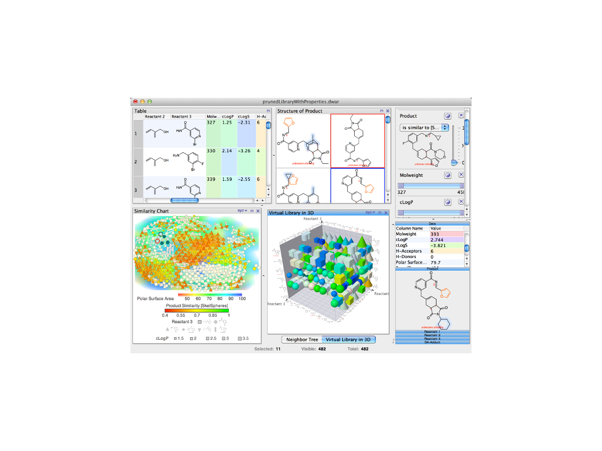 DataWarrior combines dynamic graphical views and interactive row filtering with chemical intelligence. Scatter plots, box plots, bar charts, and pie charts not only visualize numerical or category data but also show trends of multiple scaffolds or compound substitution patterns. Chemical descriptors encode various aspects of chemical structures, e.g. the chemical graph, chemical functionality from a synthetic chemist’s point of view or 3-dimensional pharmacophore features. These allow for fundamentally different types of molecular similarity measures, which can be applied for many purposes including row filtering and the customization of graphical views. It supports the enumeration of combinatorial libraries as the creation of evolutionary libraries.