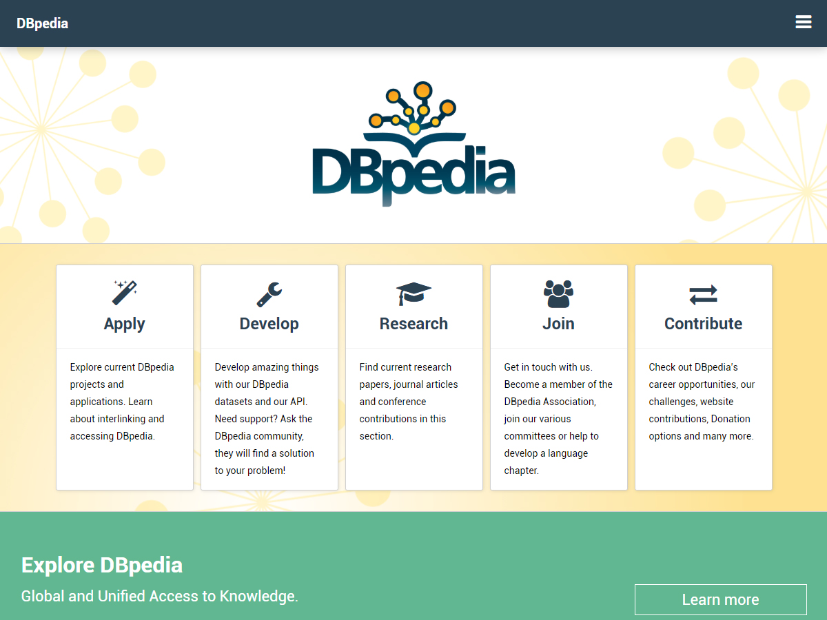 DBpedia allows you to ask sophisticated queries against Wikipedia and link other datasets on the web to Wikipedia data. It provides a number of services around the extracted data, like DBpedia mobile, a SPARQL endpoint, a faceted browser, a number of mappings to external ontologies, an ontology itself, etc. The project was started at the Free University of Berlin and Leipzig University, in collaboration with OpenLink Software. It is made available under free licences (CC-BY-SA), allowing others to reuse the dataset; it doesn't however use an open data license to waive the sui generis database rights. Wikipedia articles consist mostly of free text, but also include structured information embedded in the articles. This structured information is extracted and put in a uniform dataset that can be queried.