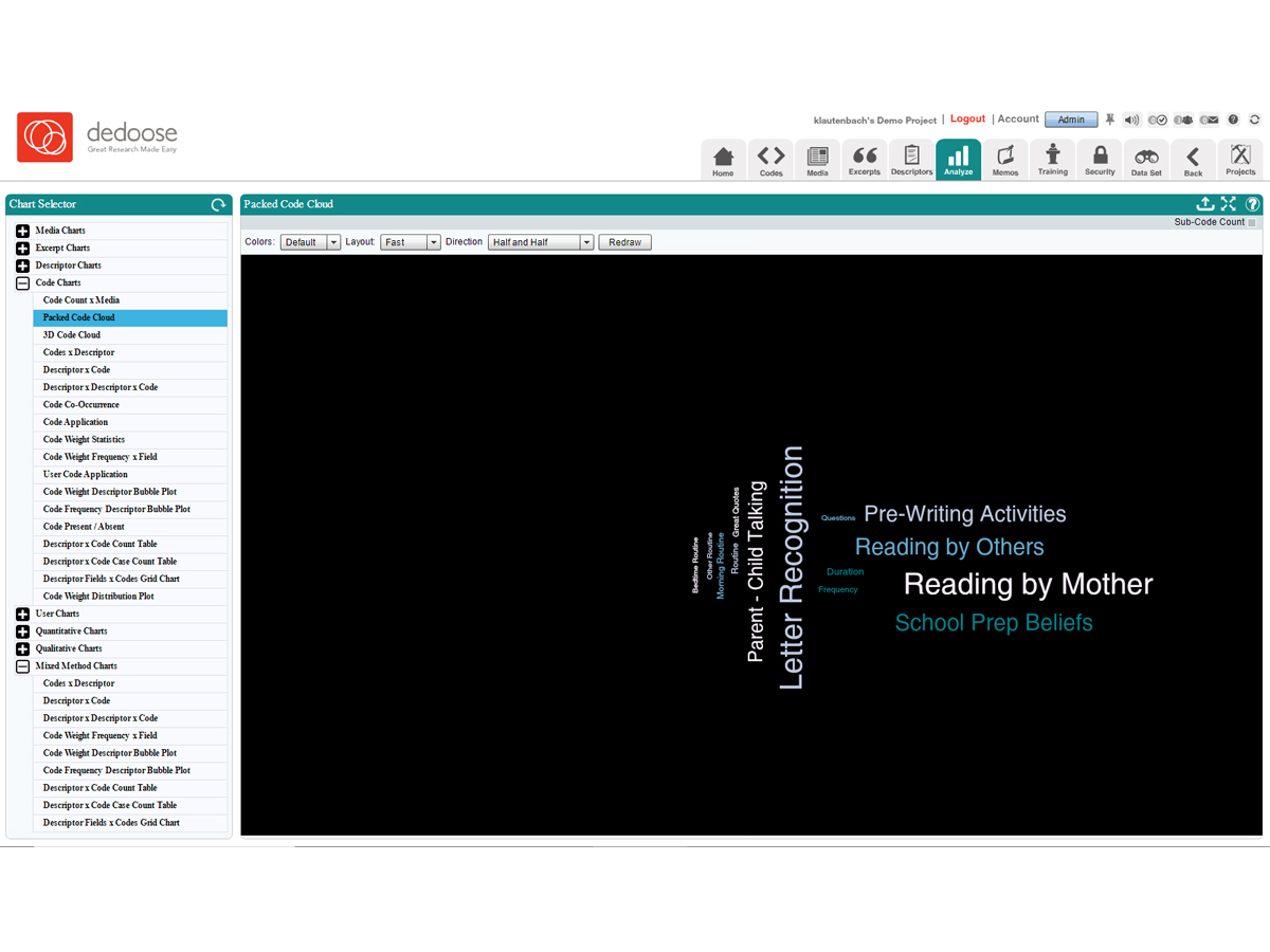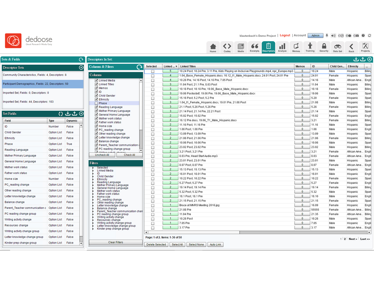 Dedoose is a cloud-based collaboration platform for researchers in a variety of industries including the sciences, teachers, students, data analysts and more. It offers communication tools, file management, and task assignment. It allows users to analyze qualitative and mixed-methods research with text, photos, audio, videos, spreadsheet data and more. Users can create and modify “codes” to tag various stages of their methodology and organize research procedures. Users can begin projects based on existing data sets or create projects directly. An integrated chat feature and memos enable users to communicate with one another in real-time. Access groups can be established to specify permissions settings for groups of users, which determines which data they may view and modify.