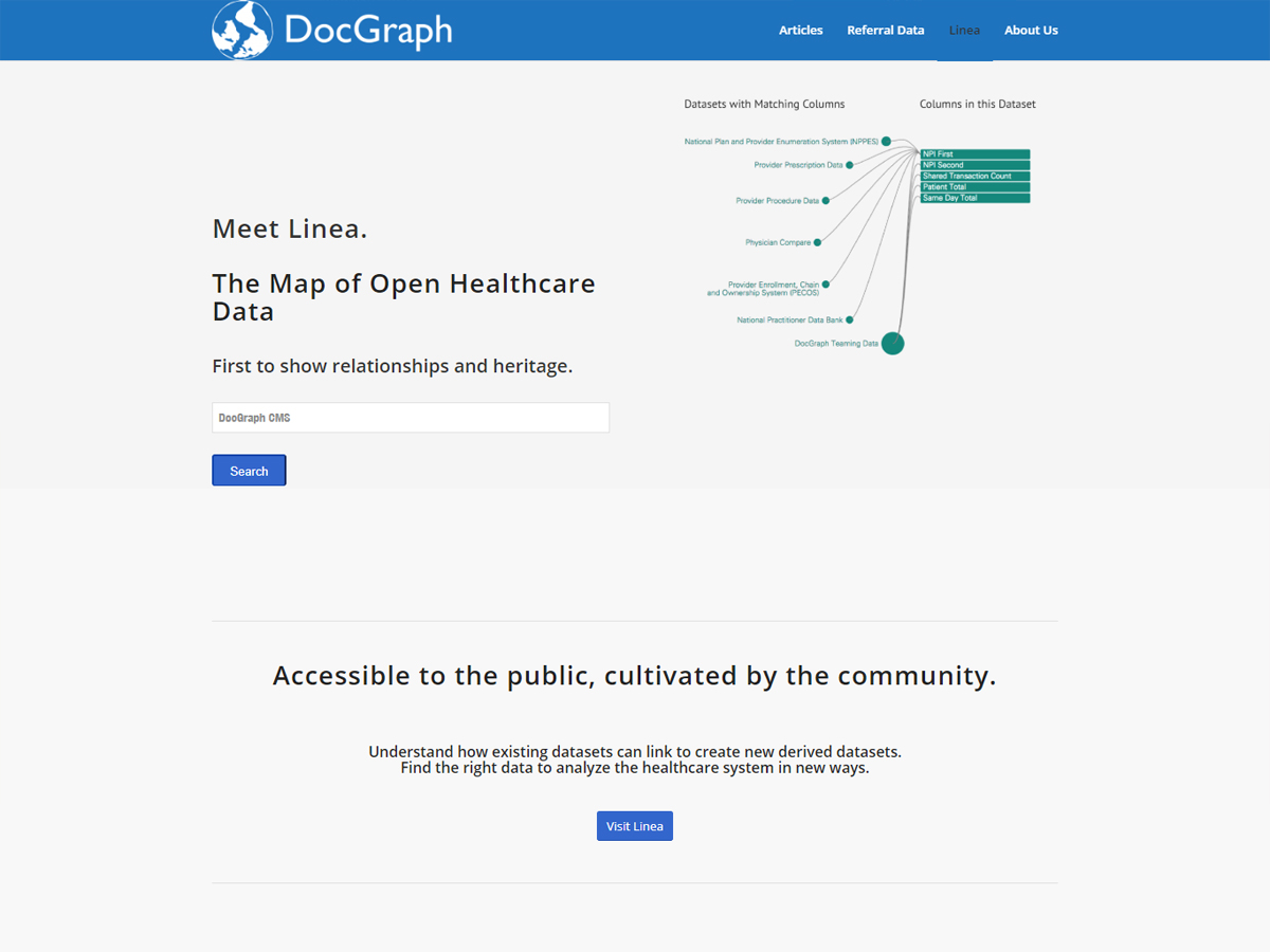 DocGraph Linea provides data scientists a socially-enabled community open data platform that collects details about disparate healthcare datasets, and further allows the community to extend what data is available. Users can search datasets, understand data lineage, view relationship matrices, add metadata, and see community algorithms.