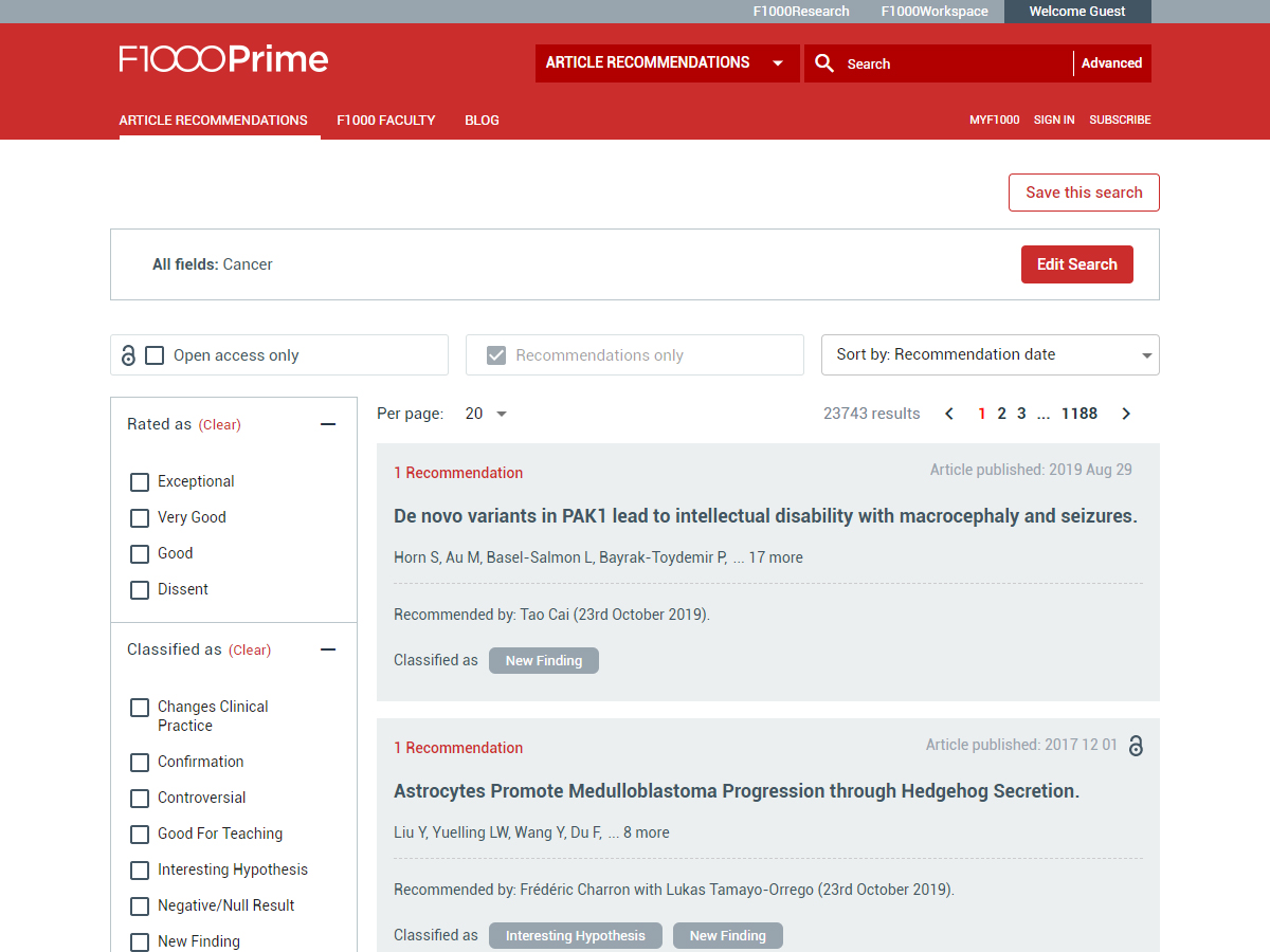 F1000Prime is a literature awareness tool that is updated continuously and comprehensively and systematically highlights and reviews the most interesting papers published in the biological and medical sciences, based on the recommendations of a faculty of leading researchers. Through immediate rating of individual papers by the authors’ peers, F1000 Prime highlights papers on the basis of their scientific merit rather than that of the journal in which they appear. Faculty of 1000 (F1000) Biology & Medicine are merged into one and now called F1000Prime. Includes over 40 Faculties (Broad subject areas such as biochemistry, ecology or plant biology), which are further subdivided into over 300 Sections. On average, 1,500 new evaluations are published each month.