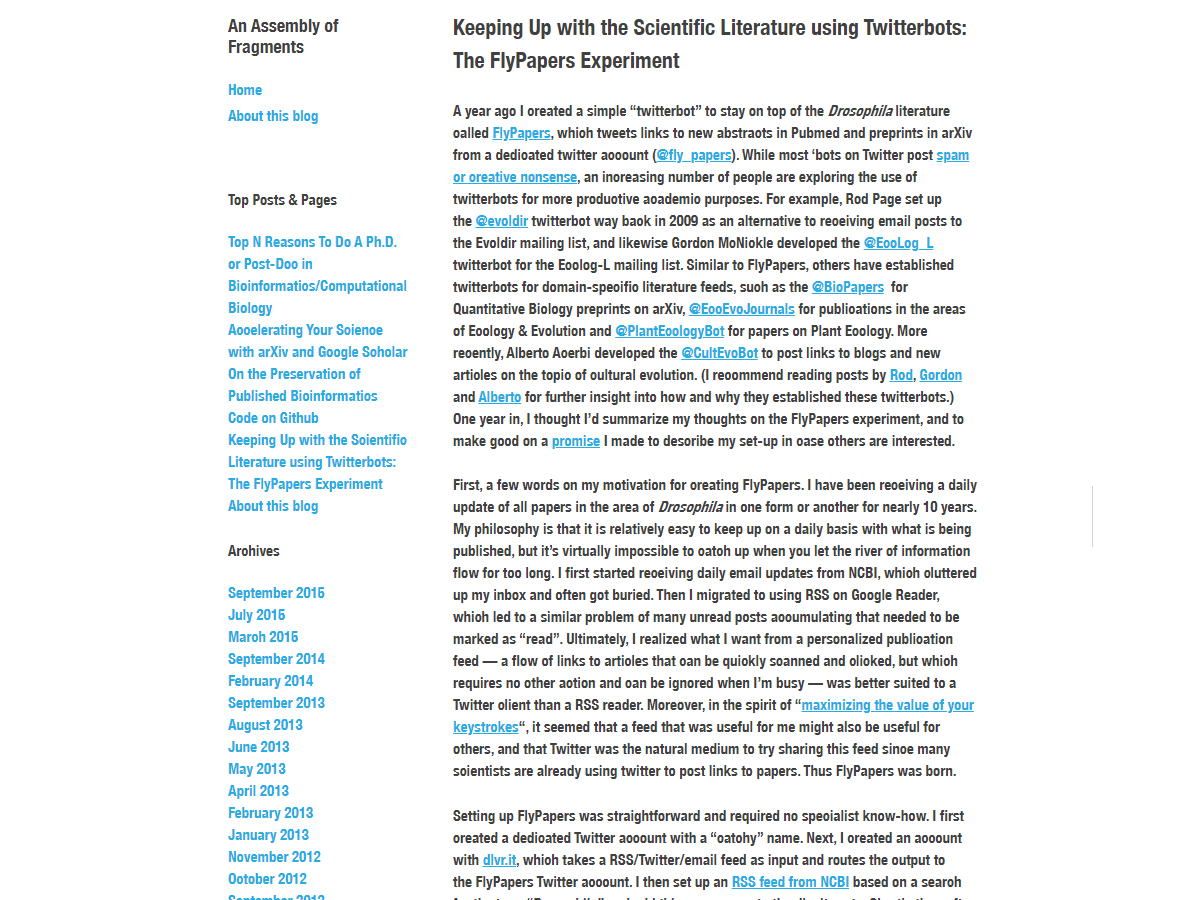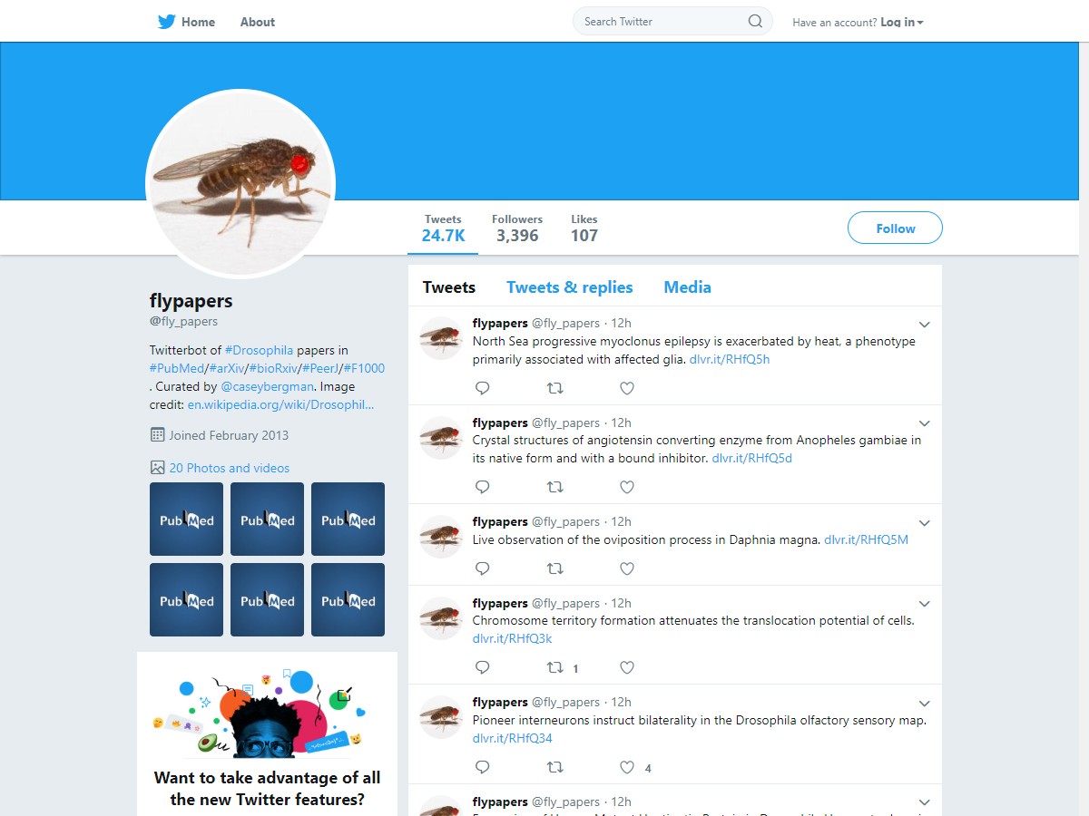 FlyPapers is a Twitterbot created by Casey Bergman to keep up with Drosophila literature by automatically tweeting new abstracts in Pubmed and preprints in arXiv.