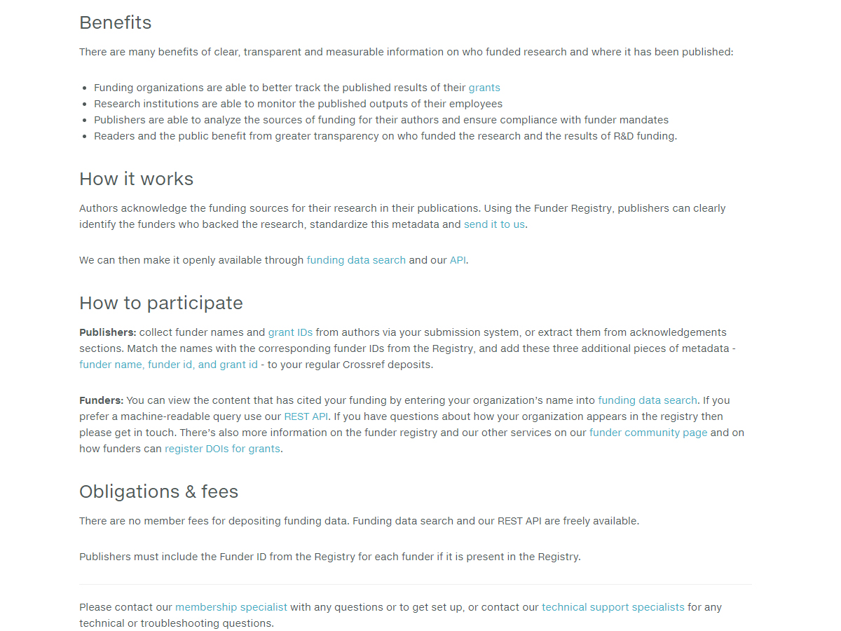 Funder Registry (FundRef until November 2015) aims to provide a solution to track funding sources. It’s an open and unique registry of persistent identifiers for grant-giving organizations around the world. It enables multiple parties to better understand the research funding landscape. Researchers can read and assess literature in the context of knowing who funded it; research institutions can monitor the published outputs of their researchers; and publishers can track who is funding their authors and check if they’re meeting funding mandates. Facilitated by Crossref, Funder Registry is a collaborative project of scholarly publishers and funding agencies that supports a standard way of reporting funding sources for published scholarly research.