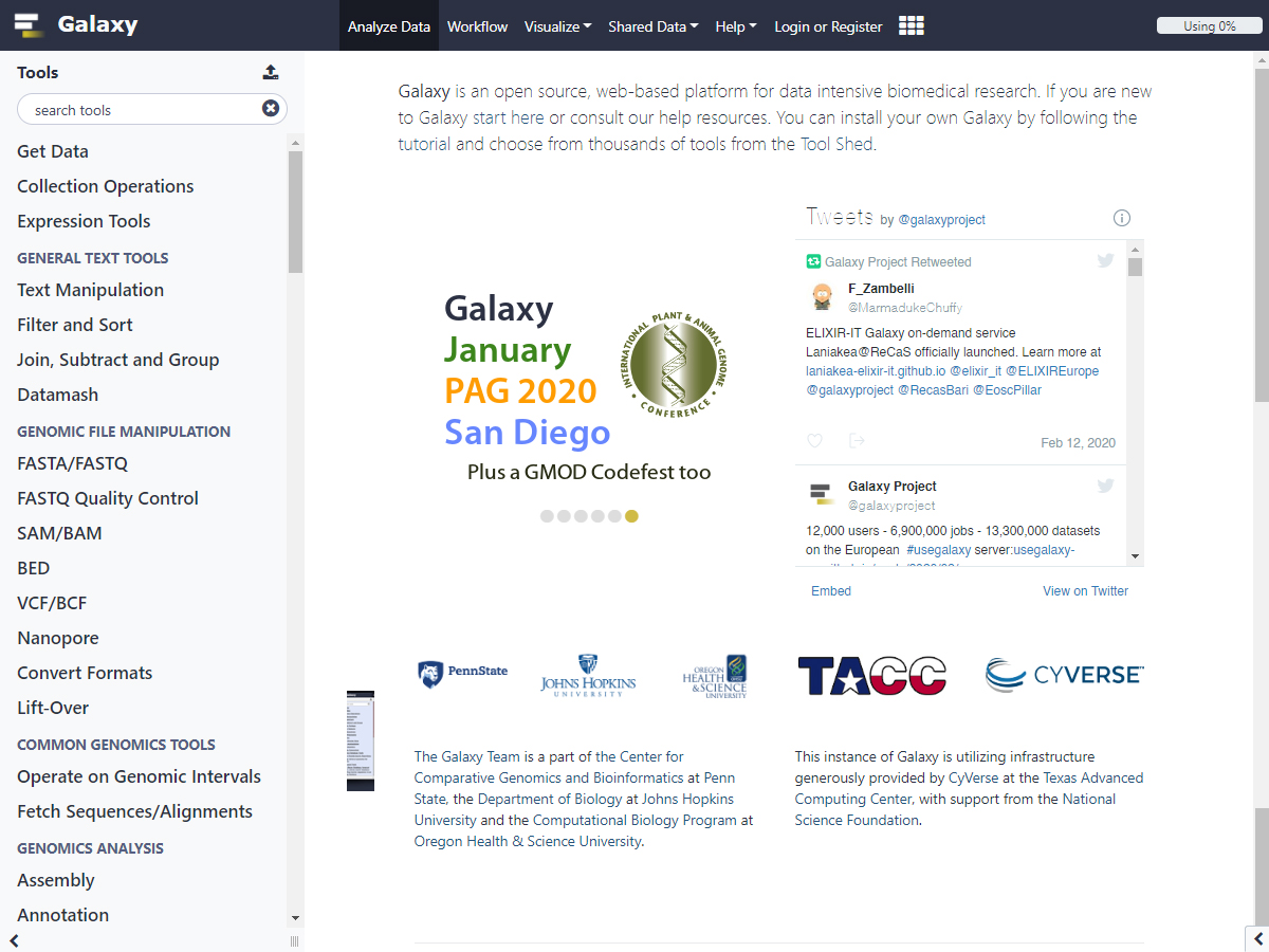 Galaxy is an open-source, web-based platform for accessible, reproducible, and transparent computational biomedical research. It integrates hundreds of popular statistical and bioinformatical tools for genomic sequencing data analysis. It allows users without programming experience to easily specify parameters and run individual tools as well as larger workflows. It also captures run information so that any user can repeat and understand a complete computational analysis. Finally, it allows users to share and publish analyses via the web.