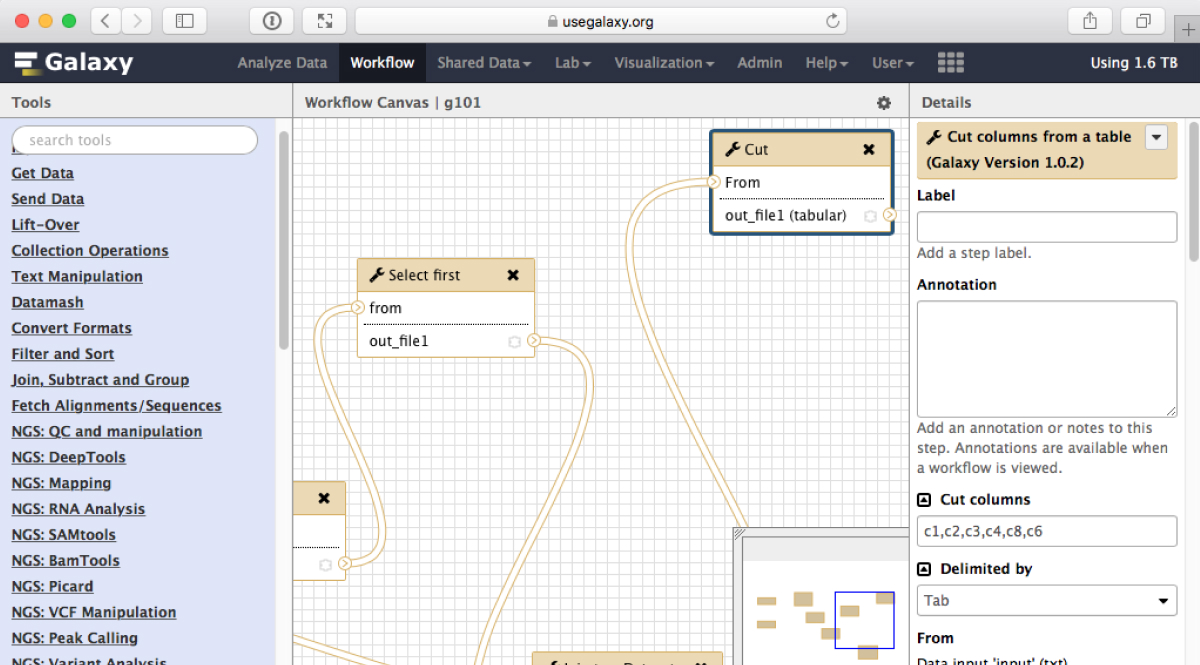 Galaxy is a scientific workflow, data integration, and data and analysis persistence and publishing platform that aims to make computational biology accessible to research scientists that do not have computer programming or systems administration experience. Although it was initially developed for genomics research, it is largely domain agnostic and is now used as a general bioinformatics workflow management system.