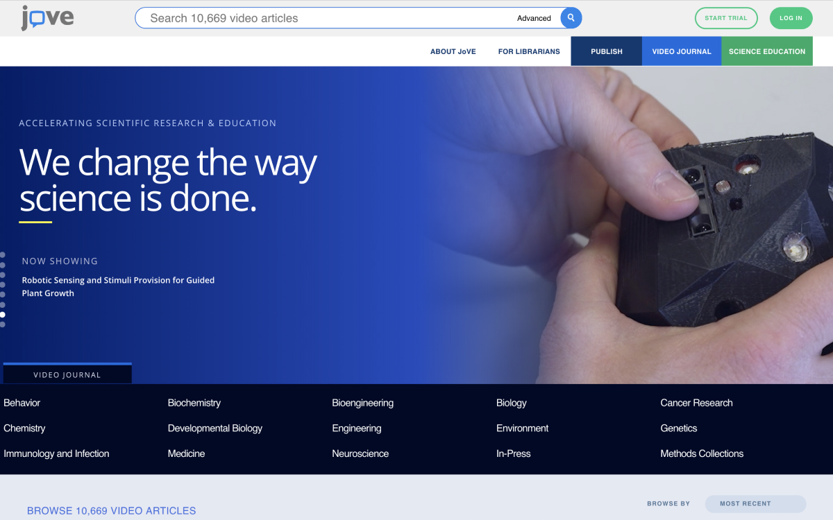 The Journal of Visualized Experiments (styled JoVE) covers research methods and experimental techniques from both the physical and life sciences. The journal currently has 13 sections: Biology, Developmental Biology, Neuroscience, Immunology and Infection, Medicine, Bioengineering, Engineering, Chemistry, Behavior, Environment, Biochemistry, Cancer Research, and Genetics. JoVE also publishes Science Education collections aimed at instructing scientists in fundamental concepts and methods in a range of fields including biology, chemistry, physics, psychology, and practical subjects like laboratory safety, cell culturing, and care of Drosophila flies.