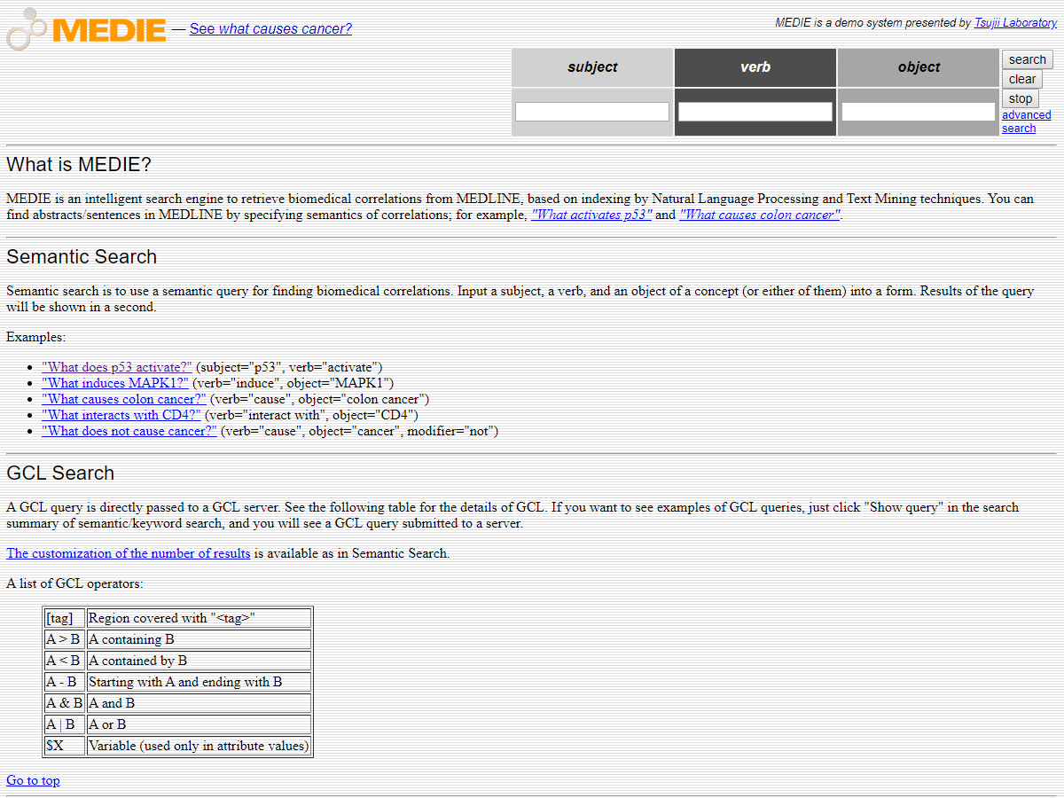 MEDIE is based on indexing by Natural Language Processing and Text Mining techniques. The text mining tools focus on certain biological entities like proteins (iHOP) (Hoffman and Valencia, 2005) and certain grammatical structures like subject-verb-object.