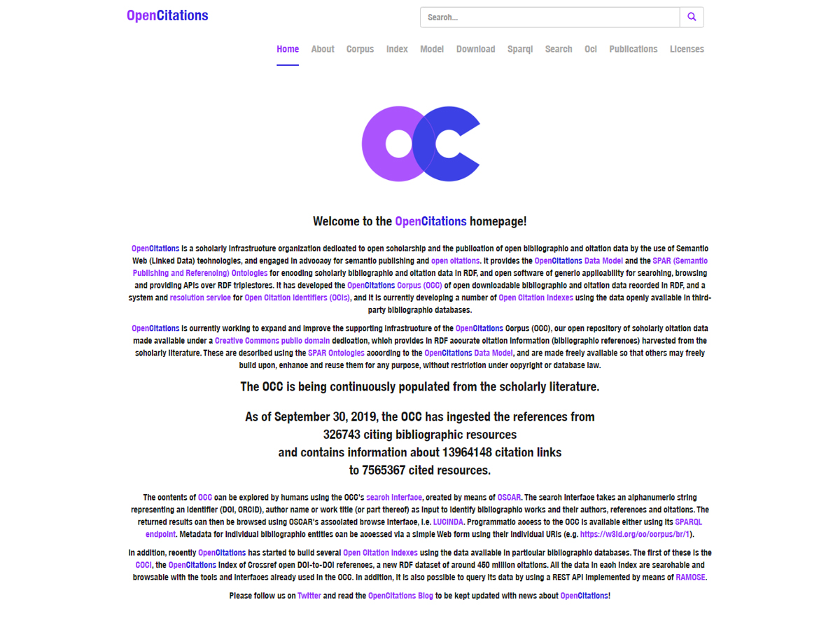 OpenCitations is a scholarly infrastructure organization dedicated to open scholarship and the publication of open bibliographic and citation data by the use of Semantic Web (Linked Data) technologies, and engaged in advocacy for semantic publishing and open citations. It provides the OpenCitations Data Model and the SPAR (Semantic Publishing and Referencing) Ontologies for encoding scholarly bibliographic and citation data in RDF, and open software of generic applicability for searching, browsing and providing APIs over RDF triplestores. It has developed the OpenCitations Corpus (OCC) of open downloadable bibliographic and citation data recorded in RDF, and a system and resolution service for Open Citation Identifiers.