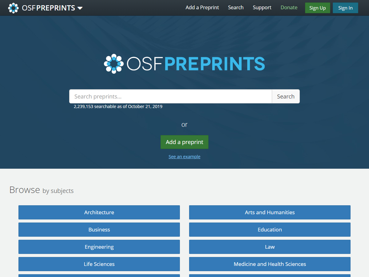 OSF Preprints was launched in early September 2016 and is currently comprised of about 19 (with the 20th on the way!) disciplinary spaces where folks can contribute their scholarship. OSF refers to the Open Science Framework which was developed by the Center for Open Science.