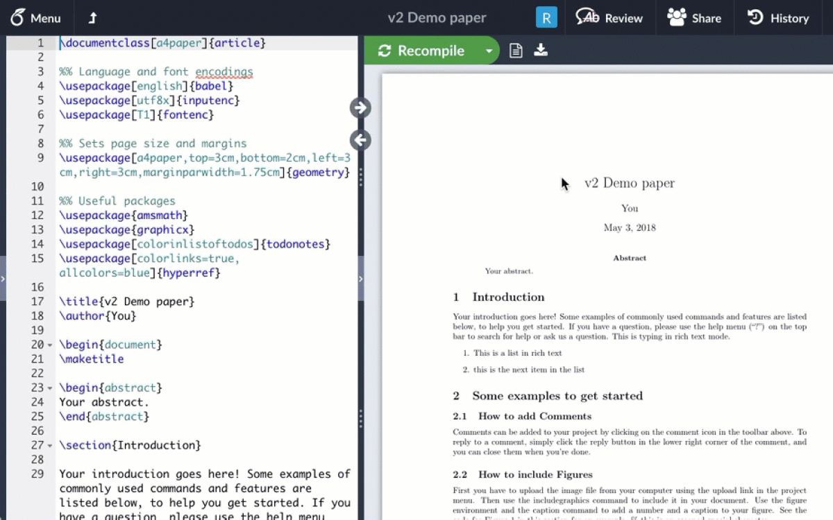 The easy to use, online, collaborative LaTeX editor. There's nothing complicated or difficult for you to install, and you can start using LaTeX right now, even if you've never seen it before. Overleaf comes with a complete, ready to go LaTeX environment which runs on our servers.