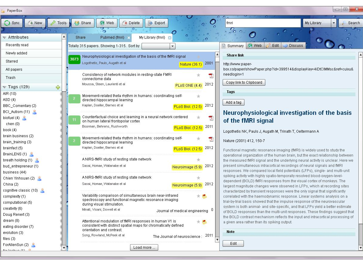 A cloud-based tool that allows you to manage papers and PDFs and access them anywhere (Windows, Mac, and Linux). It also makes it easy to share with friends and collaborators. We hope PaperBox will make your work more productive.