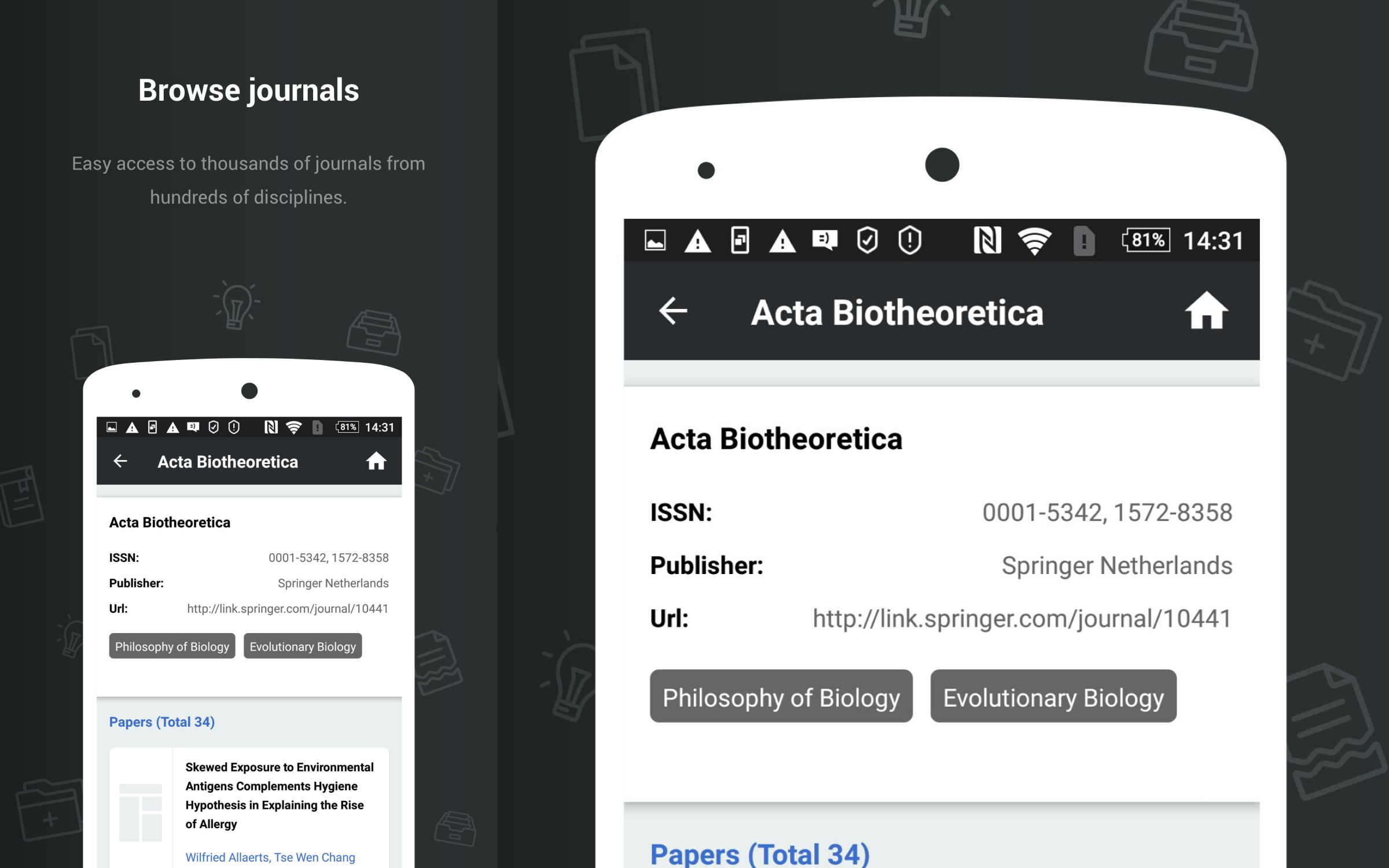 Paperity launched in October 2014 with 160,000 articles. As of March 2018, Paperity includes 1.5 million articles from 4,200 journals, covering all academic disciplines: mathematical sciences, life sciences, medicine, social sciences, humanities, arts. Paperity provides full-text search, RSS feeds and a mobile application to access the literature. All articles are available in full text without fees. Paperity shares the aggregated metadata with other academic services: EBSCO, Altmetric, WorldCat, OCLC, Plagiat.pl, StrikePlagiarism.com.
