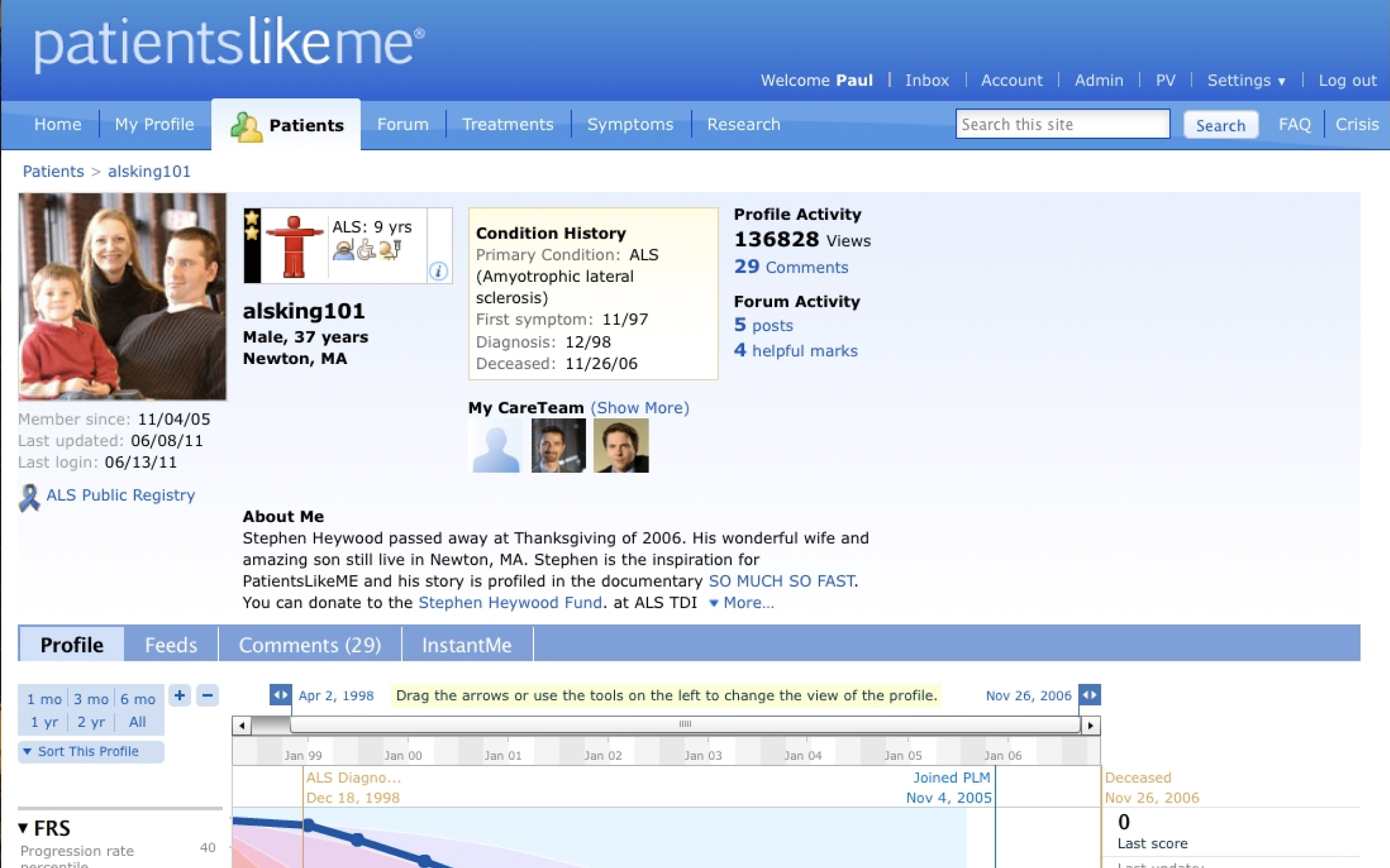 Through the network, patients connect with others who have the same disease or condition and track and share their own experiences with the goal to improve outcomes. In the process, they generate data about the real-world nature of disease. With over 600,000 members, PatientsLikeMe is a source for real-world disease information and its patient-generated data form the basis of more than 100 peer-reviewed scientific studies. PatientsLikeMe was inspired by the life experiences of Stephen Heywood, diagnosed in 1998 at the age of 29 with amyotrophic lateral sclerosis (ALS), or Lou Gehrig's disease. The company was founded in 2004 by his brothers Jamie and Ben Heywood and long-time family friend Jeff Cole.