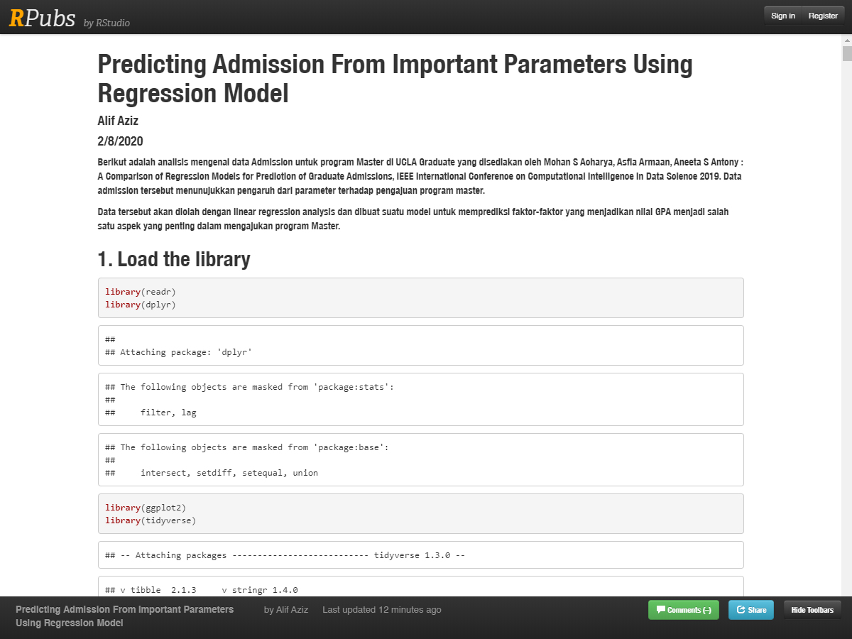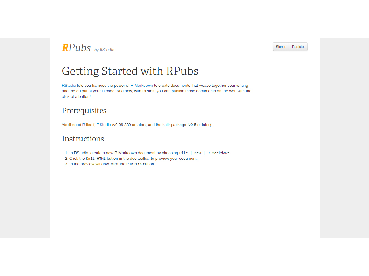 Rpubs is an open publishing platform for HTML documents produced using RMarkdown from within RStudio, it provides a simple way to host and share your presentations and documents. Documents stored on RPubs are available publically and allow other to comment on your content.