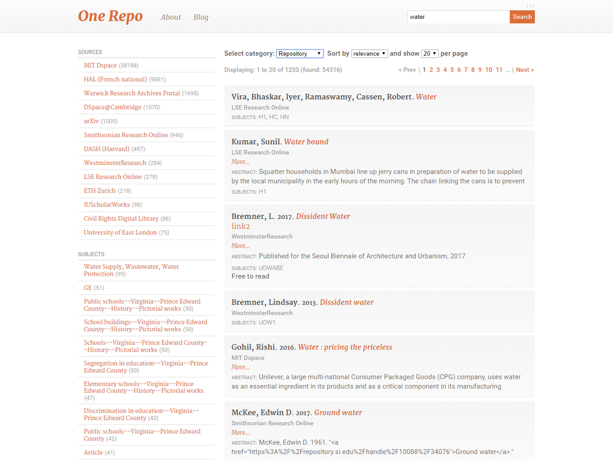 The One Repo aims to solve the problem of IR fragmentation by providing a single point for searching all of the world's IRs. It has been created by Index Data, a small, privately owned software house, with a history of open-source software and a strong open-access ethos. The One Repo aggregates records from numerous backend databases—primarily, but not necessarily institutional repositories—and integrates them into a single easy-to-use UI.